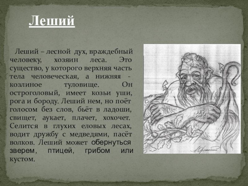 у которого верхняя часть тела человеческая, а нижняя - козлиное туловище. Он остроголовый, имеет козьи уши, рога и бороду. Леший нем, но поёт голосом без слов, бьёт в ладоши, свищет, аукает, плачет, хохочет. Селится в глухих еловых лесах, водит дружбу с медведями, пасёт волков. Леший может обернуться зверем, птицей, грибом или кустом.