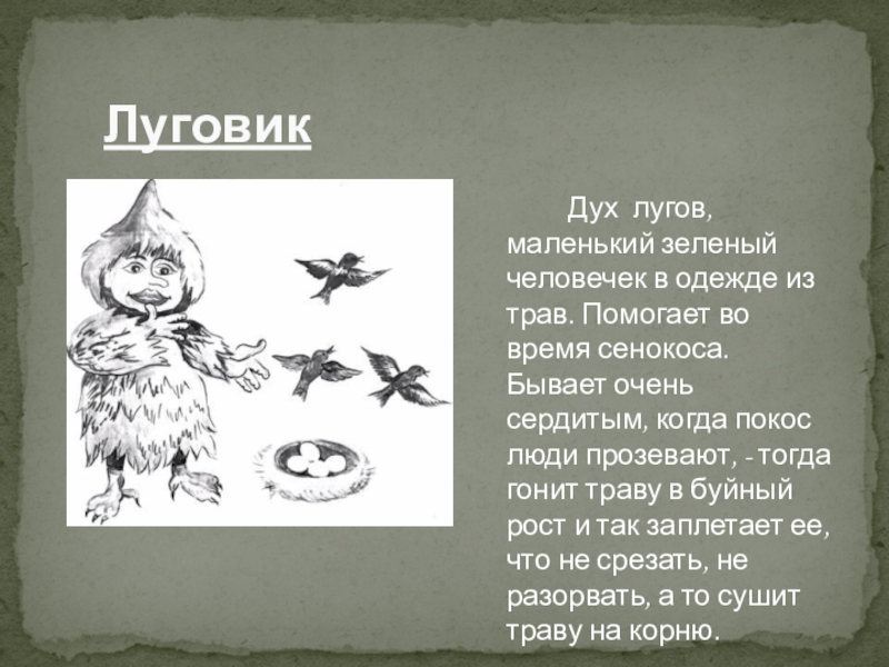 Дух лугов, маленький зеленый человечек в одежде из трав. Помогает во