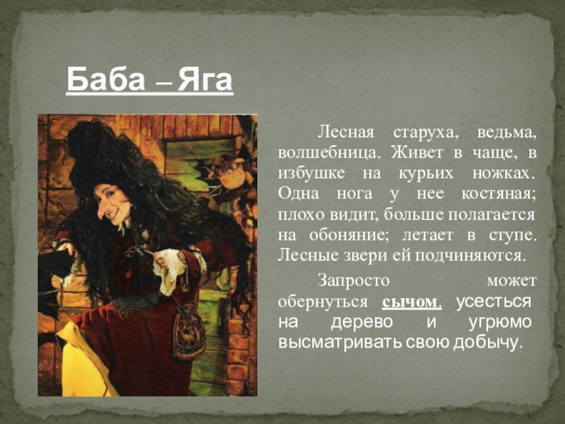 на курьих ножках. Одна нога у нее костяная; плохо видит, больше полагается на обоняние; летает в ступе. Лесные звери ей подчиняются.