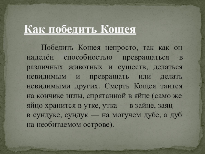 Победить Кощея непросто, так как он наделён способностью превращаться