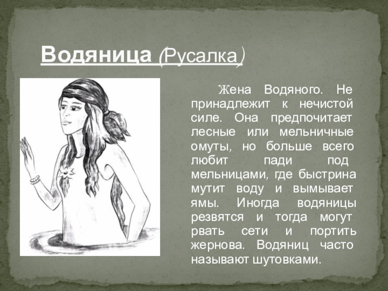 Жена Водяного. Не принадлежит к нечистой силе. Она предпочитает лесные