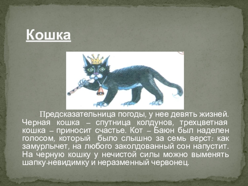 трехцветная кошка – приносит счастье. Кот – Баюн был наделен голосом, который было слышно за семь верст: как замурлычет, на любого заколдованный сон напустит. На черную кошку у нечистой силы можно выменять шапку-невидимку и неразменный червонец.