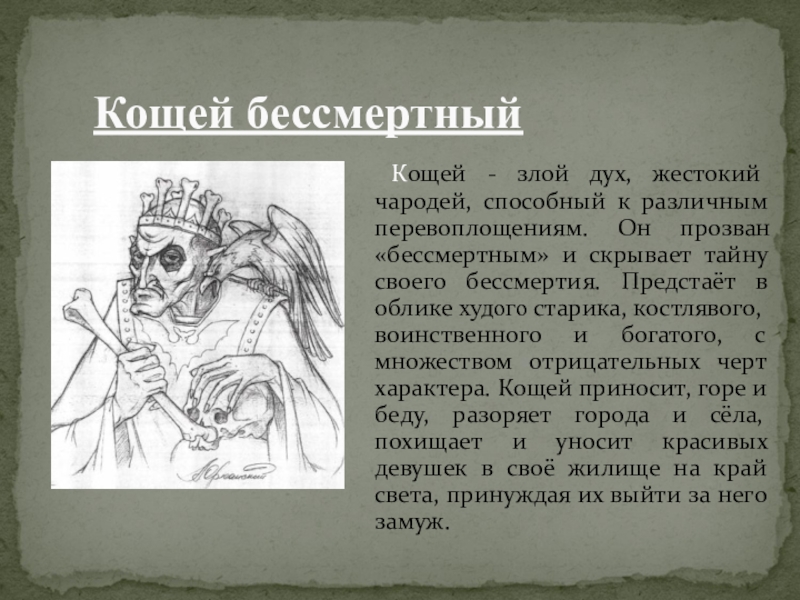 Кощей - злой дух, жестокий чародей, способный к различным перевоплощениям.