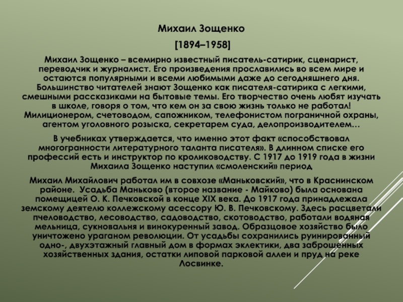 переводчик и журналист. Его произведения прославились во всем мире и остаются популярными и всеми любимыми даже до сегодняшнего дня. Большинство читателей знают Зощенко как писателя-сатирика с легкими, смешными рассказиками на бытовые темы. Его творчество очень любят изучать в школе, говоря о том, что кем он за свою жизнь только не работал! Милиционером, счетоводом, сапожником, телефонистом пограничной охраны, агентом уголовного розыска, секретарем суда, делопроизводителем…
