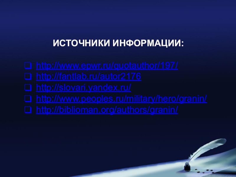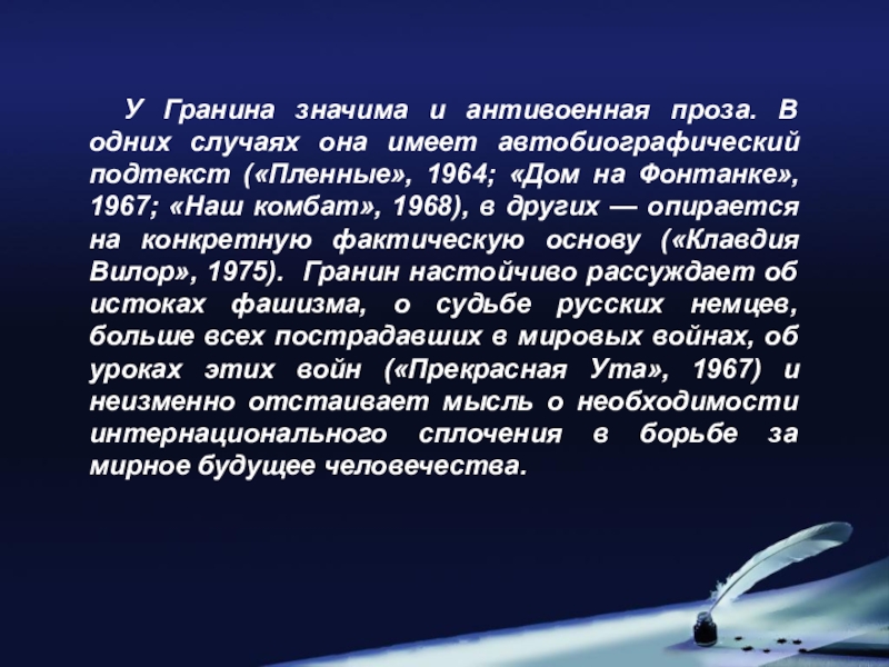 Слайд 12У Гранина значима и антивоенная проза. В одних случаях она имеет