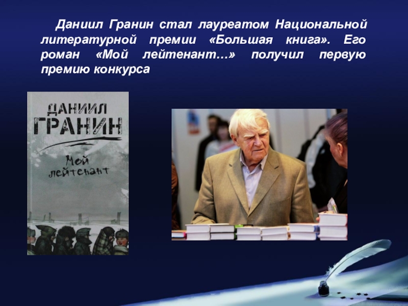 Слайд 14Даниил Гранин стал лауреатом Национальной литературной премии «Большая книга». Его роман