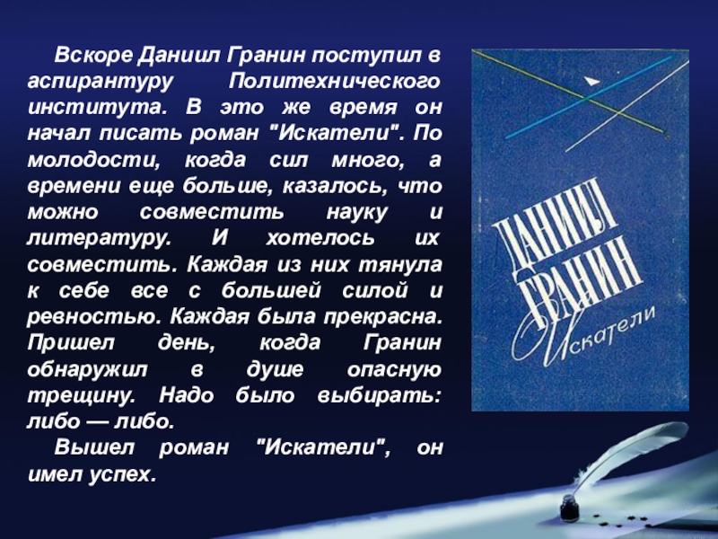 время он начал писать роман "Искатели". По молодости, когда сил много, а времени еще больше, казалось, что можно совместить науку и литературу. И хотелось их совместить. Каждая из них тянула к себе все с большей силой и ревностью. Каждая была прекрасна. Пришел день, когда Гранин обнаружил в душе опасную трещину. Надо было выбирать: либо — либо.