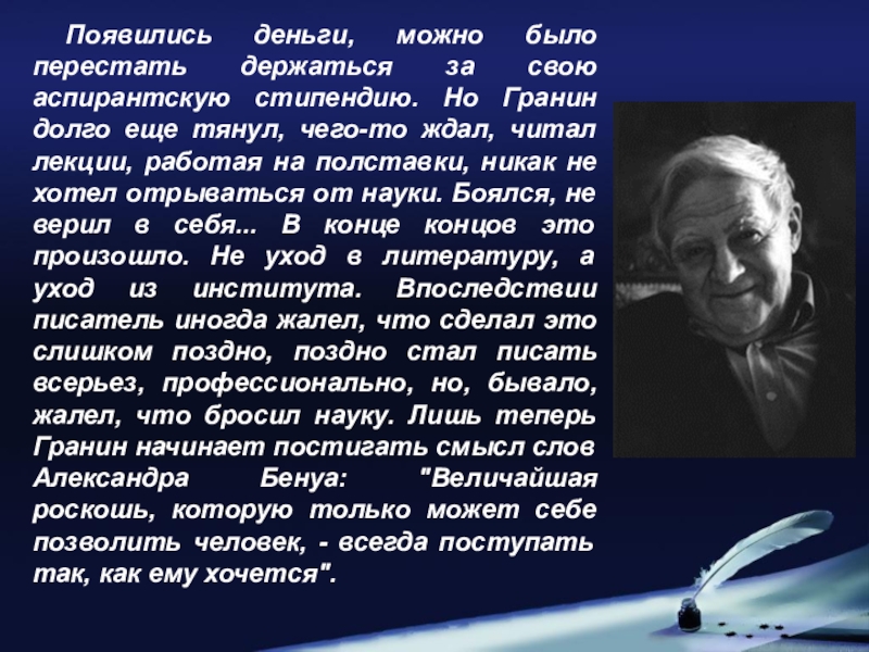 Гранин долго еще тянул, чего-то ждал, читал лекции, работая на полставки, никак не хотел отрываться от науки. Боялся, не верил в себя... В конце концов это произошло. Не уход в литературу, а уход из института. Впоследствии писатель иногда жалел, что сделал это слишком поздно, поздно стал писать всерьез, профессионально, но, бывало, жалел, что бросил науку. Лишь теперь Гранин начинает постигать смысл слов Александра Бенуа: "Величайшая роскошь, которую только может себе позволить человек, - всегда поступать так, как ему хочется".
