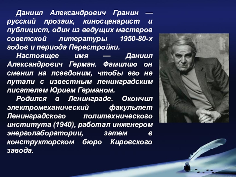 Слайд 3Даниил Александрович Гранин — русский прозаик, киносценарист и публицист, один из