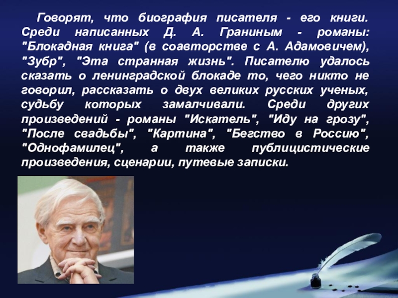 Слайд 13Говорят, что биография писателя - его книги. Среди написанных Д. А.