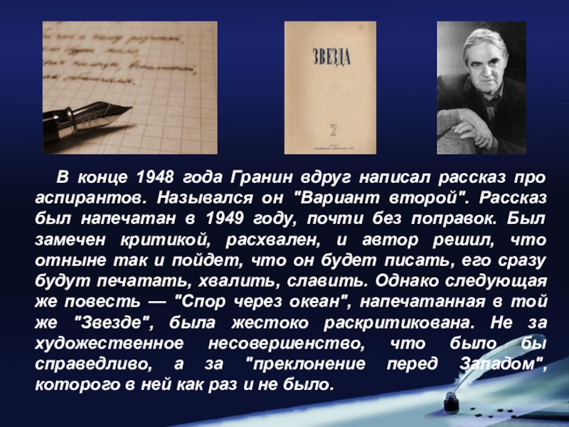 Слайд 6В конце 1948 года Гранин вдруг написал рассказ про аспирантов. Назывался