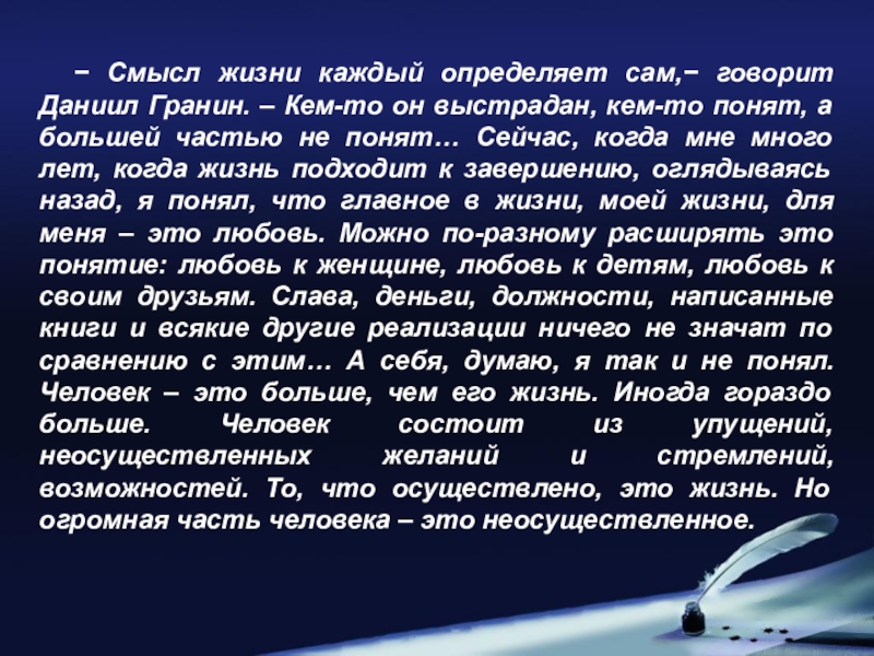 Слайд 17− Смысл жизни каждый определяет сам,− говорит Даниил Гранин. – Кем-то