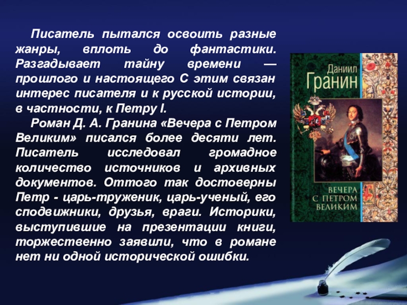 Роман Д. А. Гранина «Вечера с Петром Великим» писался более десяти лет. Писатель исследовал громадное количество источников и архивных документов. Оттого так достоверны Петр - царь-труженик, царь-ученый, его сподвижники, друзья, враги. Историки, выступившие на презентации книги, торжественно заявили, что в романе нет ни одной исторической ошибки.