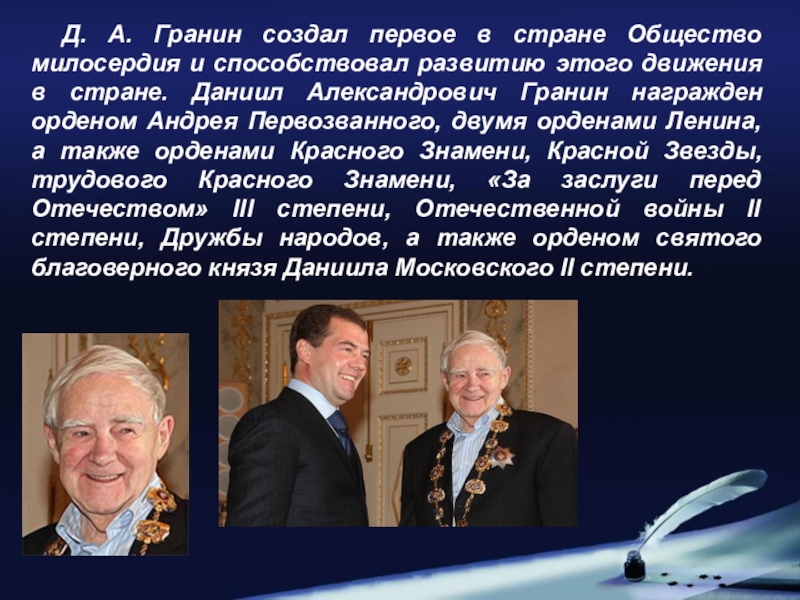 Слайд 15Д. А. Гранин создал первое в стране Общество милосердия и способствовал