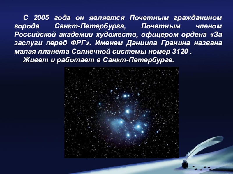Российской академии художеств, офицером ордена «За заслуги перед ФРГ». Именем Даниила Гранина названа малая планета Солнечной системы номер 3120 .