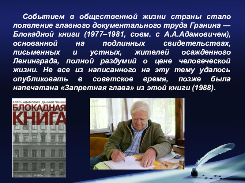 Слайд 10Событием в общественной жизни страны стало появление главного документального труда Гранина