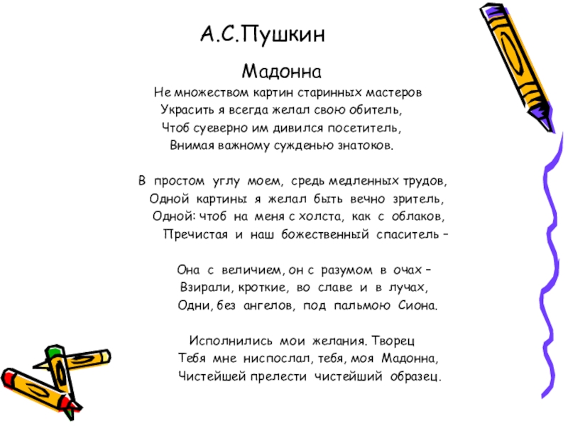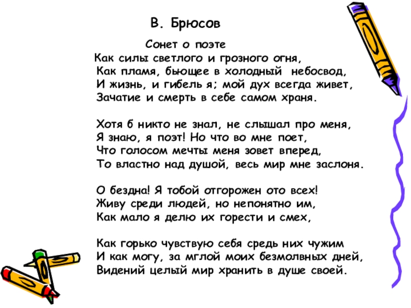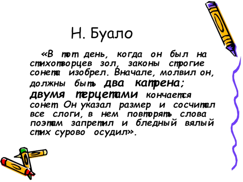 стихотворцев зол, законы строгие сонета изобрел. Вначале, молвил он, должны быть два катрена; двумя терцетами кончается сонет. Он указал размер и сосчитал все слоги, в нем повторять слова поэтам запретил и бледный вялый стих сурово осудил».