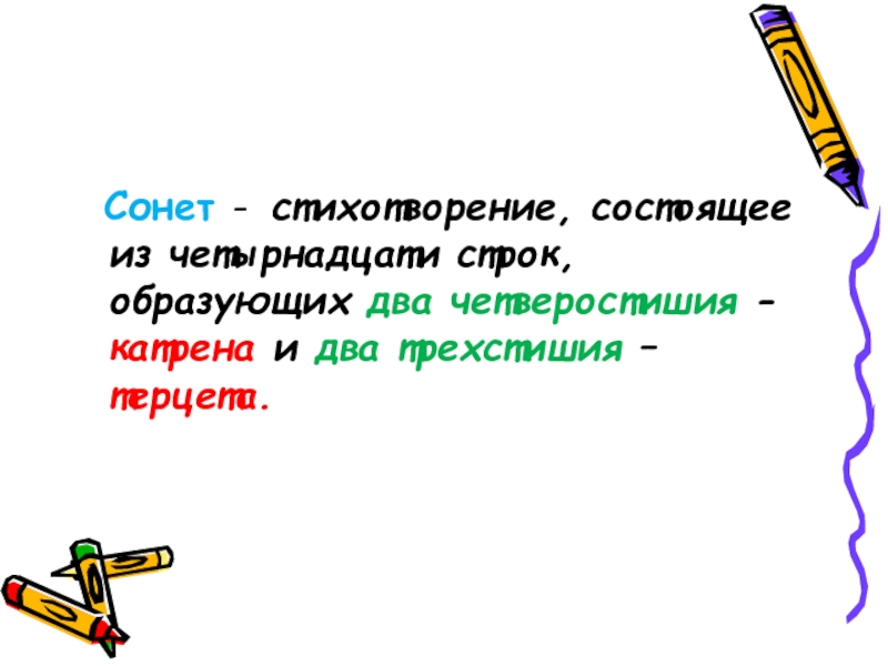 Сонет - стихотворение, состоящее из четырнадцати строк, образующих два четверостишия