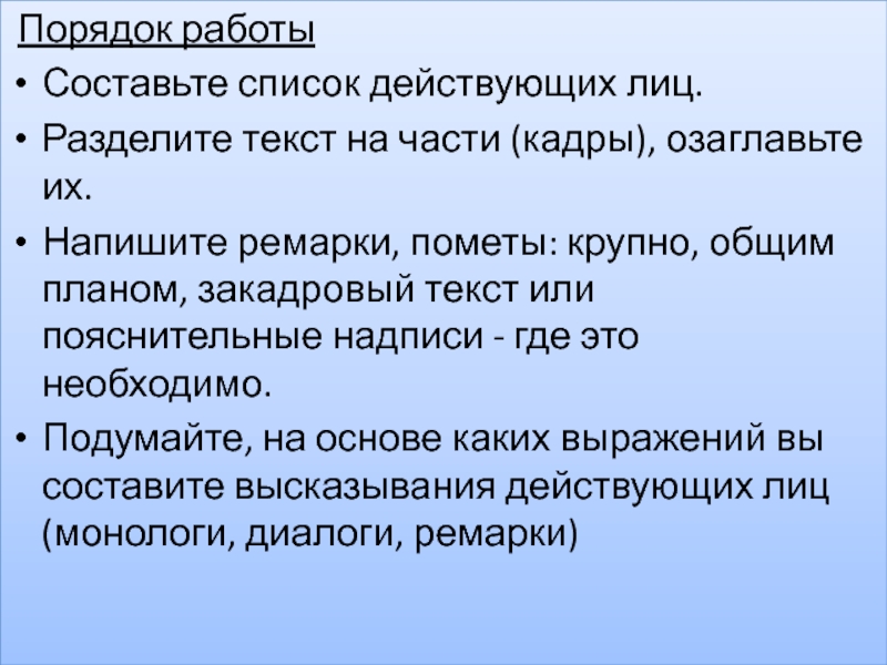 Порядок работыСоставьте список действующих лиц.Разделите текст на части (кадры), озаглавьте их.Напишите ремарки, пометы: крупно, общим планом,