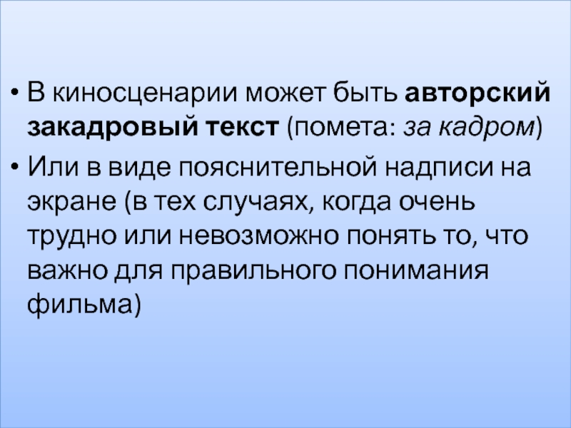 В киносценарии может быть авторский закадровый текст (помета: за кадром) Или в виде пояснительной надписи на экране