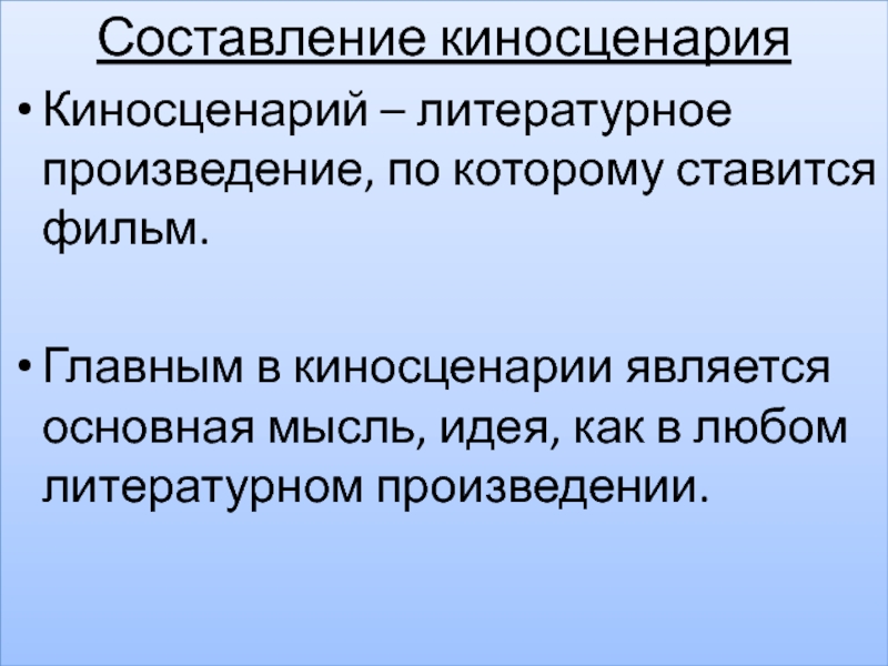 Составление киносценарияКиносценарий – литературное произведение, по которому ставится фильм. Главным в киносценарии является основная мысль, идея, как