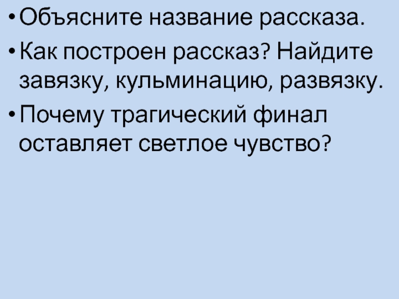 Объясните название рассказа.Как построен рассказ? Найдите завязку, кульминацию, развязку.Почему трагический финал оставляет светлое чувство?