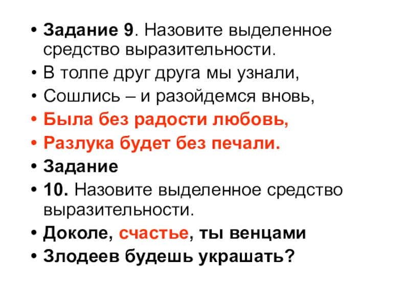 Задание 9. Назовите выделенное средство выразительности.В толпе друг друга мы узнали,Сошлись – и разойдемся вновь,Была без радости