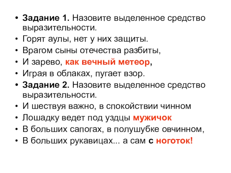 Задание 1. Назовите выделенное средство выразительности.Горят аулы, нет у них защиты.Врагом сыны отечества разбиты,И зарево, как вечный метеор,Играя в облаках, пугает взор. Задание 2. Назовите выделенное средство выразительности.И шествуя важно, в спокойствии чинномЛошадку ведет под уздцы