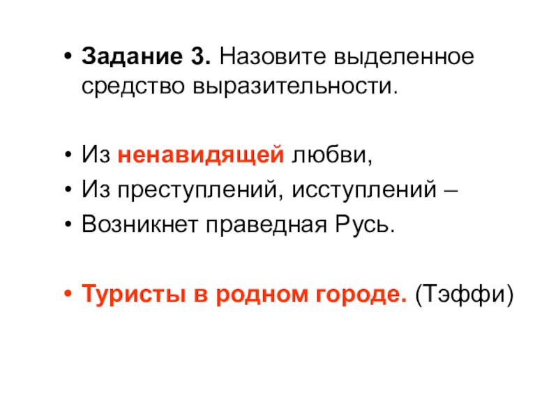 Задание 3. Назовите выделенное средство выразительности.Из ненавидящей любви,Из преступлений, исступлений –Возникнет праведная Русь.Туристы в родном городе. (Тэффи)