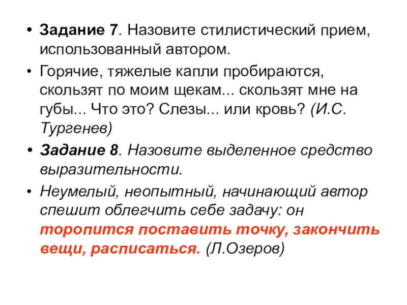 Задание 7. Назовите стилистический прием, использованный автором.Горячие, тяжелые капли пробираются, скользят по моим щекам... скользят мне на