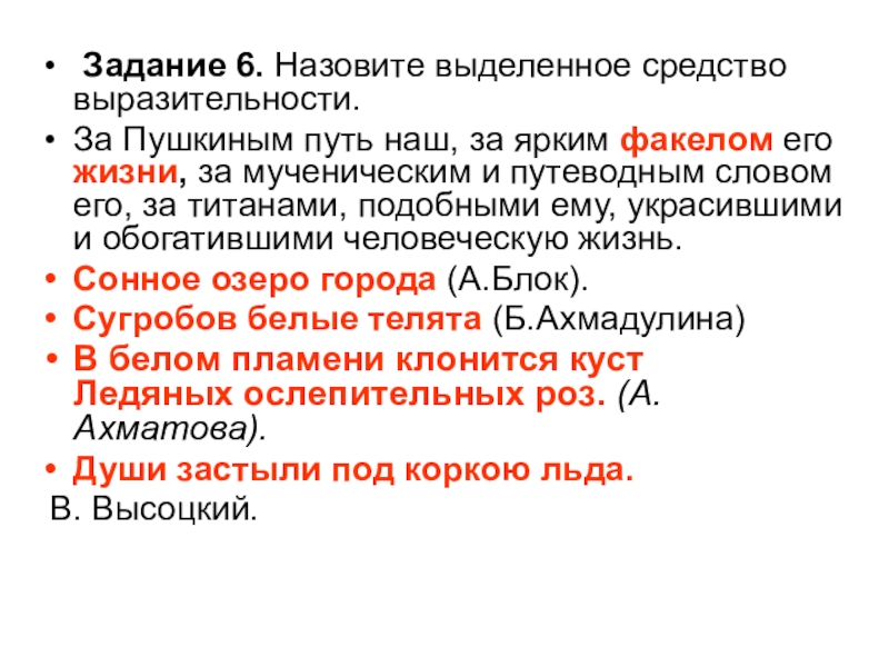 Задание 6. Назовите выделенное средство выразительности.За Пушкиным путь наш, за ярким факелом его жизни, за мученическим