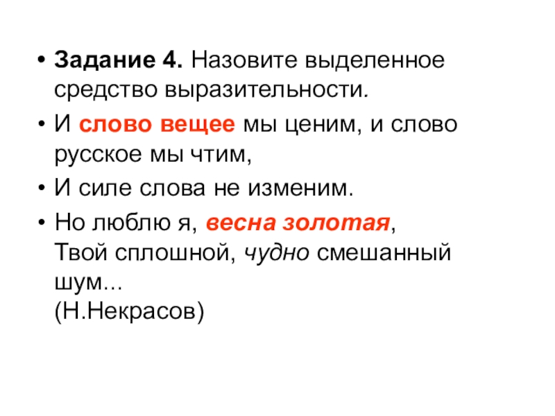 Задание 4. Назовите выделенное средство выразительности.И слово вещее мы ценим, и слово русское мы чтим,И силе слова