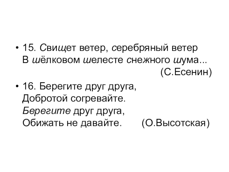 15. Свищет ветер, серебряный ветер В шёлковом шелесте снежного шума...                                                  (С.Есенин) 16. Берегите друг друга, Добротой