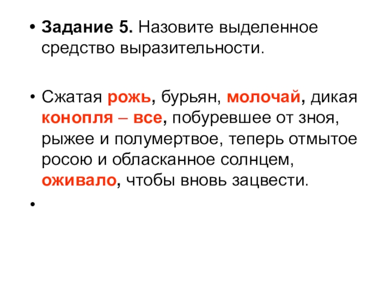 Задание 5. Назовите выделенное средство выразительности.Сжатая рожь, бурьян, молочай, дикая конопля – все, побуревшее от зноя, рыжее