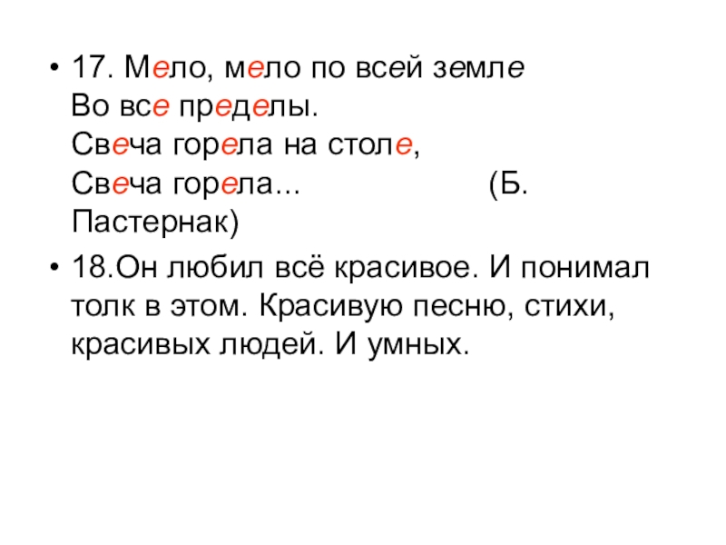17. Мело, мело по всей земле Во все пределы. Свеча горела на столе, Свеча горела...                     (Б.Пастернак) 18.Он