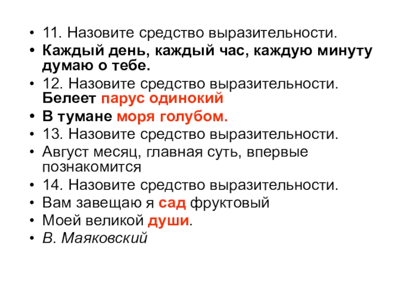 11. Назовите средство выразительности.Каждый день, каждый час, каждую минуту думаю о тебе.12. Назовите средство выразительности. Белеет парус