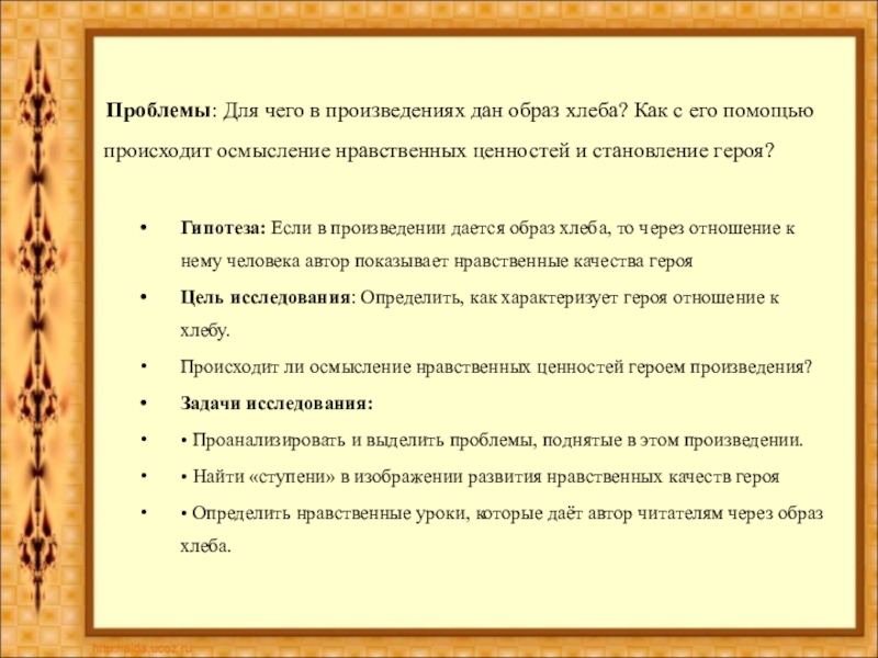 • Определить нравственные уроки, которые даёт автор читателям через образ хлеба.