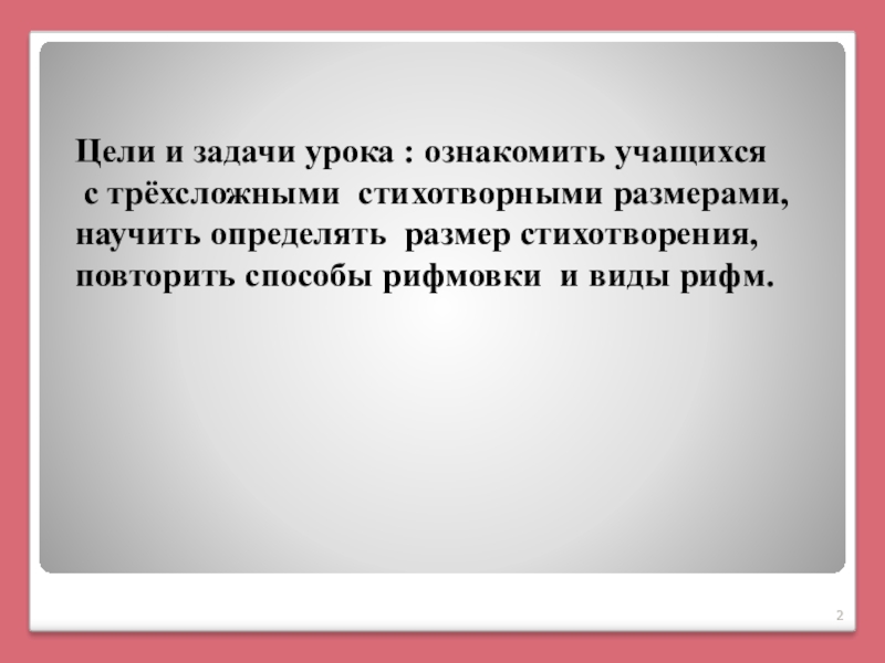 Цели и задачи урока : ознакомить учащихся с трёхсложными стихотворными размерами,научить определять размер стихотворения, повторить способы рифмовки