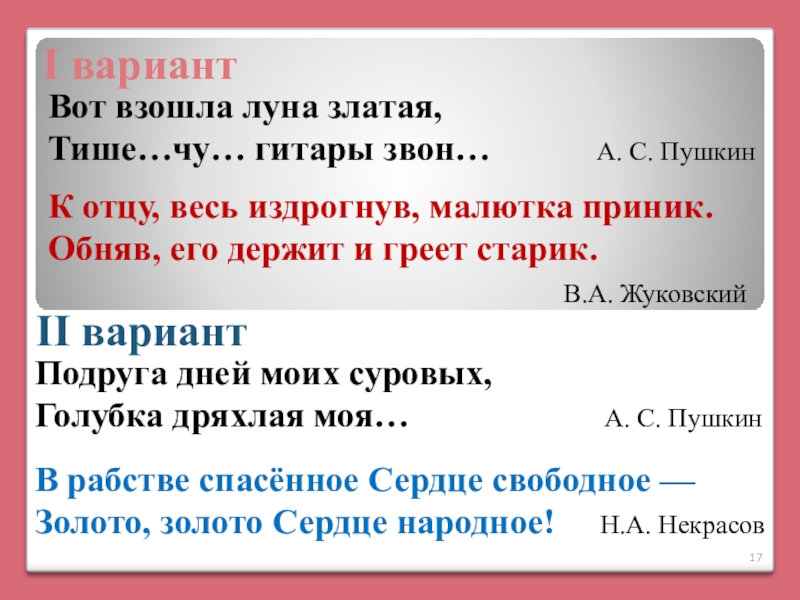 I вариантII вариантПодруга дней моих суровых,Голубка дряхлая моя…