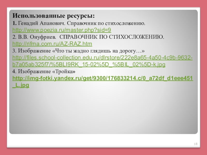 Использованные ресурсы:1. Генадий Апанович. Справочник по стихосложению.http://www.poezia.ru/master.php?sid=92. В.В. Онуфриев.  СПРАВОЧНИК ПО СТИХОСЛОЖЕНИЮ.http://rifma.com.ru/AZ-RAZ.htm3. Изображение «Что ты жадно глядишь