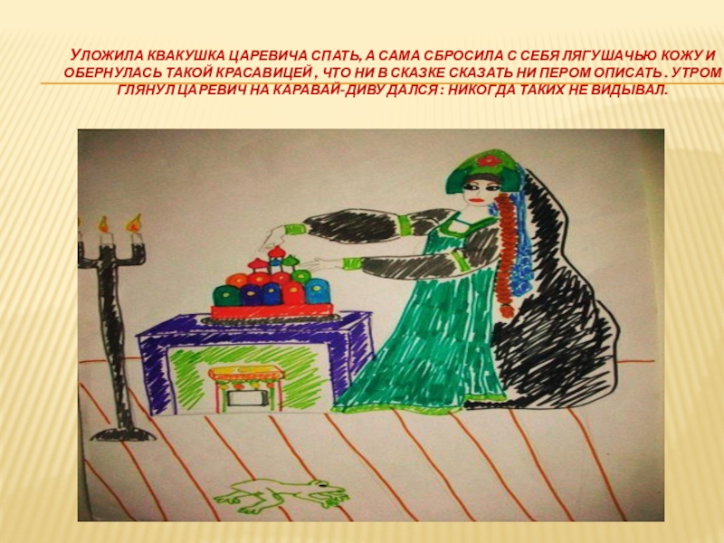 Слайд 8Уложила квакушка царевича спать, а сама сбросила с себя лягушачью кожу