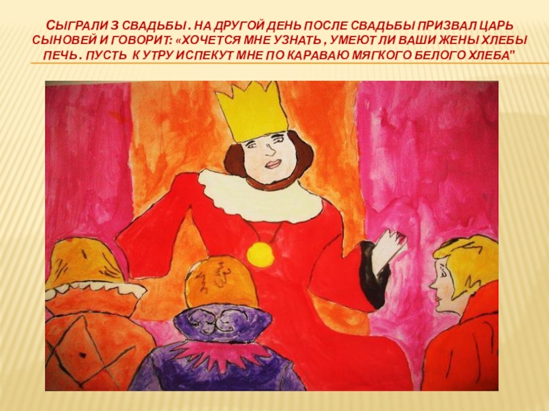 Слайд 7Сыграли 3 свадьбы . На другой день после свадьбы призвал царь