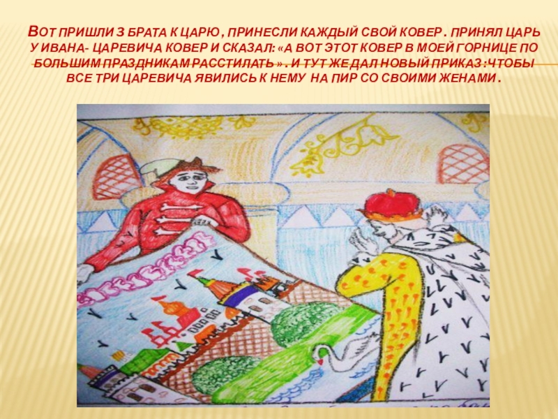 . Принял царь у Ивана- царевича ковер и сказал: «А вот этот ковер в моей горнице по большим праздникам расстилать » . И тут же дал новый приказ :чтобы все три царевича явились к нему на пир со своими женами .