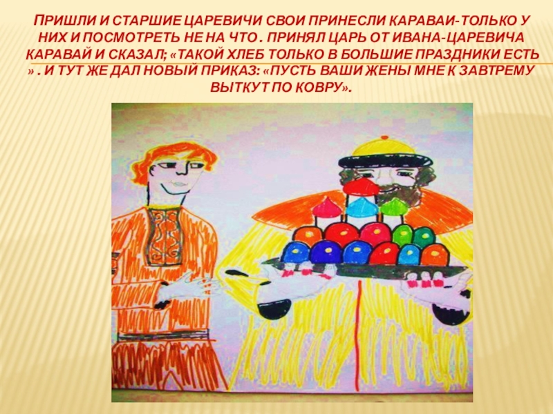 Слайд 9Пришли и старшие царевичи свои принесли караваи-только у них и посмотреть