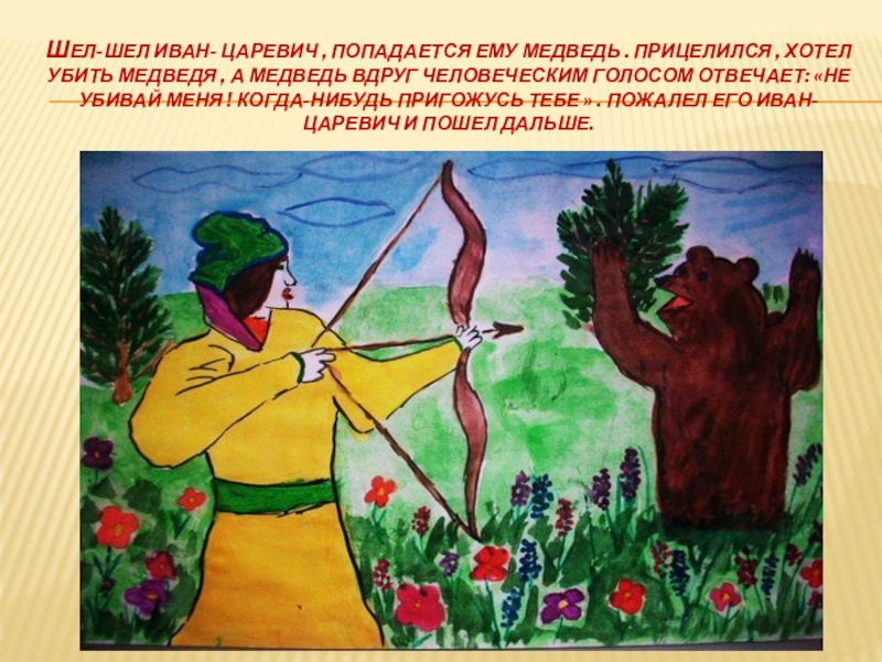 Слайд 14Шел-шел Иван- царевич , попадается ему медведь . Прицелился , хотел