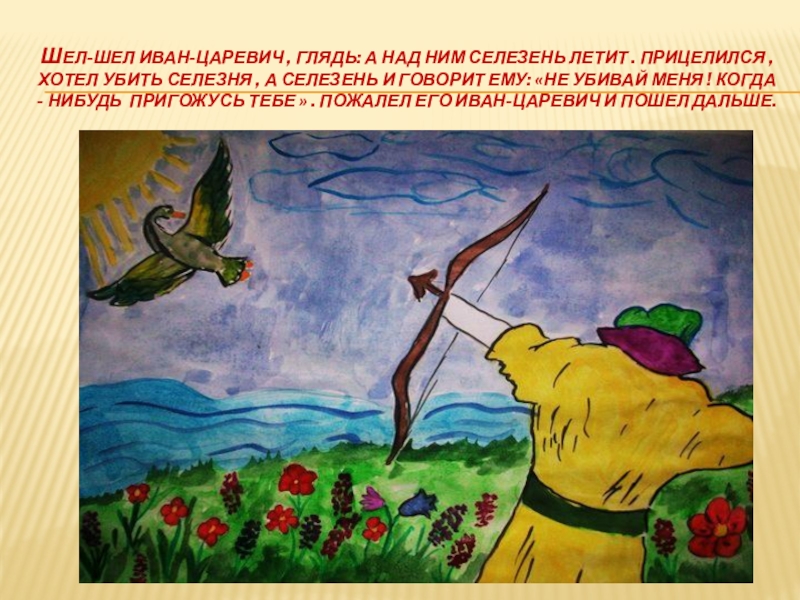 Слайд 15Шел-шел Иван-царевич , глядь: а над ним селезень летит . Прицелился