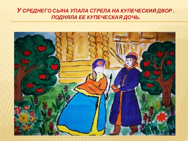 Слайд 5У среднего сына упала стрела на купеческий двор . Подняла ее