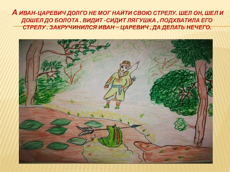 Слайд 6 А Иван-царевич долго не мог найти свою стрелу. Шел он,