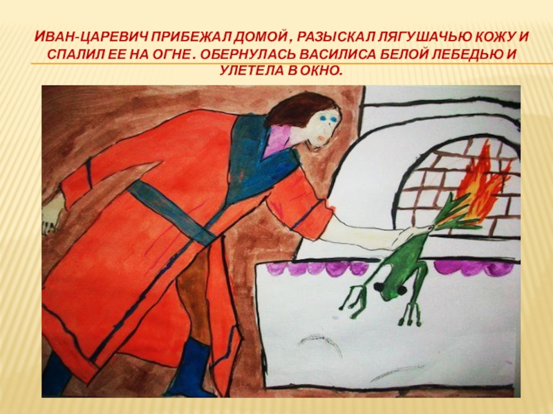 Слайд 12Иван-царевич прибежал домой , разыскал лягушачью кожу и спалил ее на