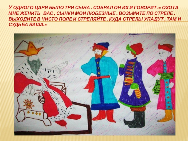 говорит :» Охота мне женить вас , сынки мои любезные . Возьмите по стреле , выходите в чисто поле и стреляйте . Куда стрелы упадут , там и судьба ваша.»